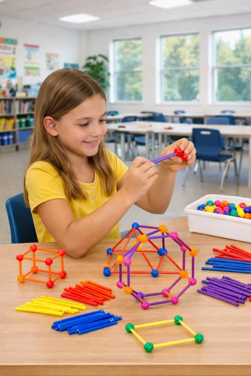 Eleverne kan bygge geometriske figurer som terninger, pyramider og prismer. De kan også lave egne kreative konstruktioner. Læring bliver sjovere, når de bruger fantasi og skaber unikke ting. Stængerne fungerer som kanter og kuglerne som hjørner, hvilket gør det nemt at visualisere begreberne.