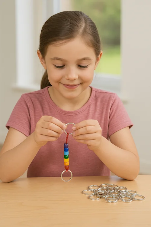 Dette sæt er ikke bare en samling nøgleringe – det er en pædagogisk ressource. Når børn arbejder med at skabe små vedhæng, styrker de både finmotorikken, kreativiteten og deres evne til at samarbejde. Samtidig kan det bruges som en øvelse i at give personlige gaver, hvilket udvikler sociale færdigheder og glæden ved at skabe noget til andre.